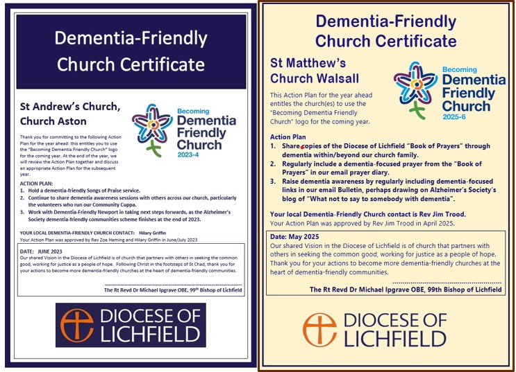So we went back to the drawing board on the design and Clive has helped us to devise a more dementia-friendly format for our certificate. You may have noticed that our Dementia-Friendly Church and School Certificates are now both in the unpdated format. You can see the old version and the new one side by side: the new Certificates have a simplified format, with dark blue writing printed on a cream background. Do explain to other people why the format has changed: we can all learn by sharing on this story.