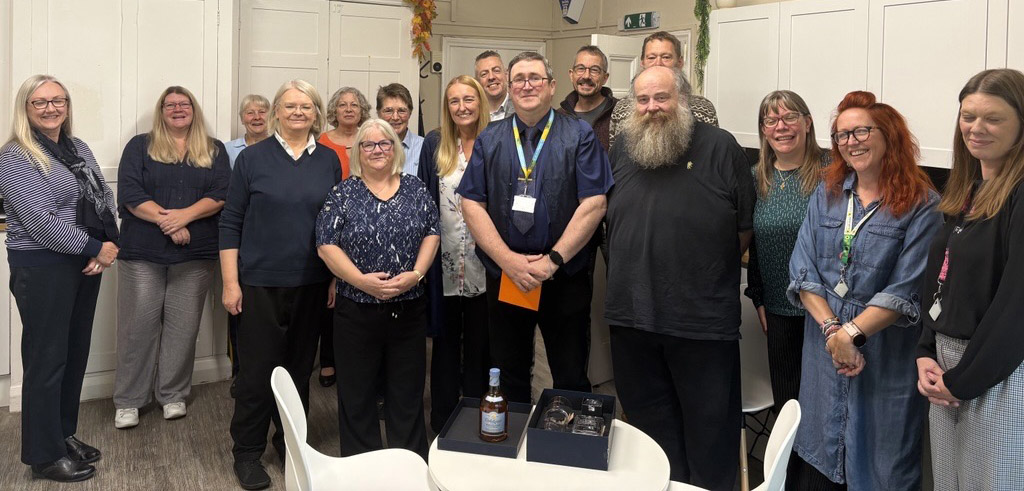 Staff gathered to mark the occasion at which current CEO, Sam Rushton presented him with the traditional engraved decanter - plus something to fill it! - thanking him for his support to the Diocese over 40 years.