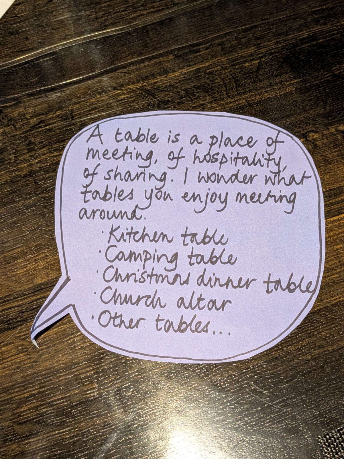 We brought our packed lunches to the table and – and enjoyed some questions as points of conversation and connection. As the table hosted us, it gave space for our own stories to be shared and honoured.