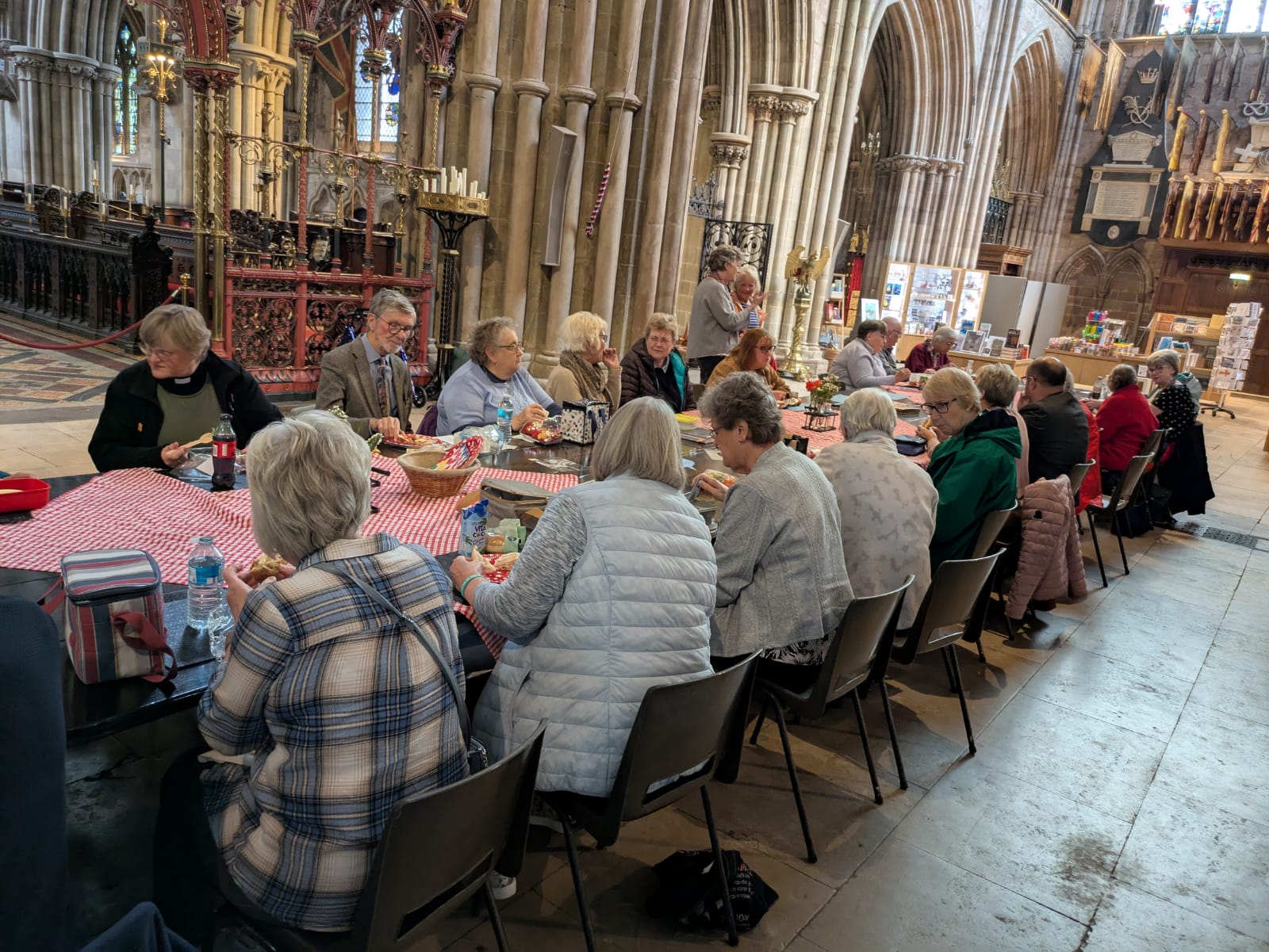 Gathering round three tables at Lichfield Cathedral